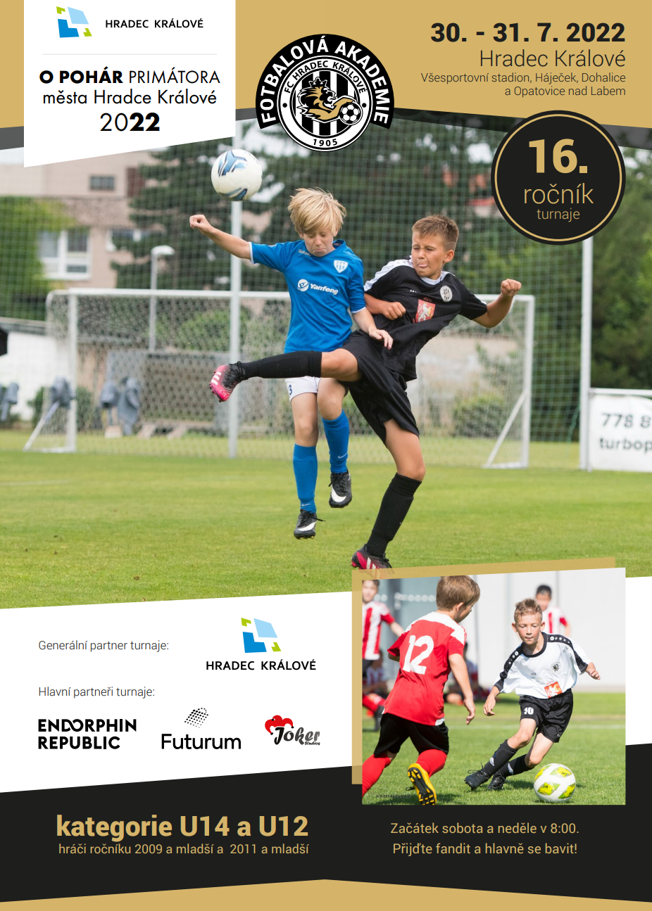 Již 16. ročník tradičního turnaje O pohár primátora města Hradce Králové se uskuteční o tomto víkendu v městě pod Bílou věží. Nadějní fotbalisté kategorií U12 a U14 budou soupeřit o vysněnou trofej. V kategorii U14 nastoupí 24 týmů, hrát se bude na Háječku a v Dohalicích. Představí se například AC Sparta Praha, FC Viktoria Plzeň či SK Sigma Olomouc.