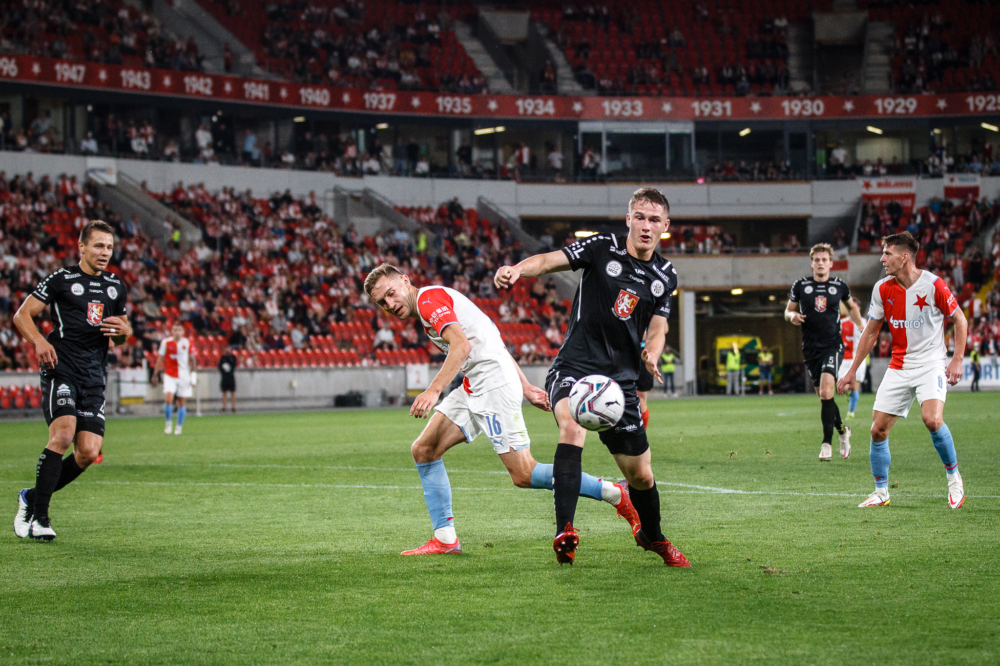 Ke konci poločasu hráli Votroci zatím nejlepší part. V 35. minutě se rýsovala zajímavá příležitost před slávistickou bránou. Adam Vlkanova zezadu obral o míč Stancia a prokličkoval se až k malému vápnu. Vše skončilo sraženou střelou mimo. O chvilku později chyběl jen kousek a Soukeník mohl konkurovat Jakubovi Radovi v soutěži o gól sezony, gólman Mandous však výborně zasáhl a střelu zvládl vyrazit. Snahu Hradce o vyrovnání však rázem zmrazil ve 40. minutě Daniel Samek poté, co využil Ševčíkovu přihrávku přesnou střelou, která se od tyče odrazila za brankovou čáru – 2:0.