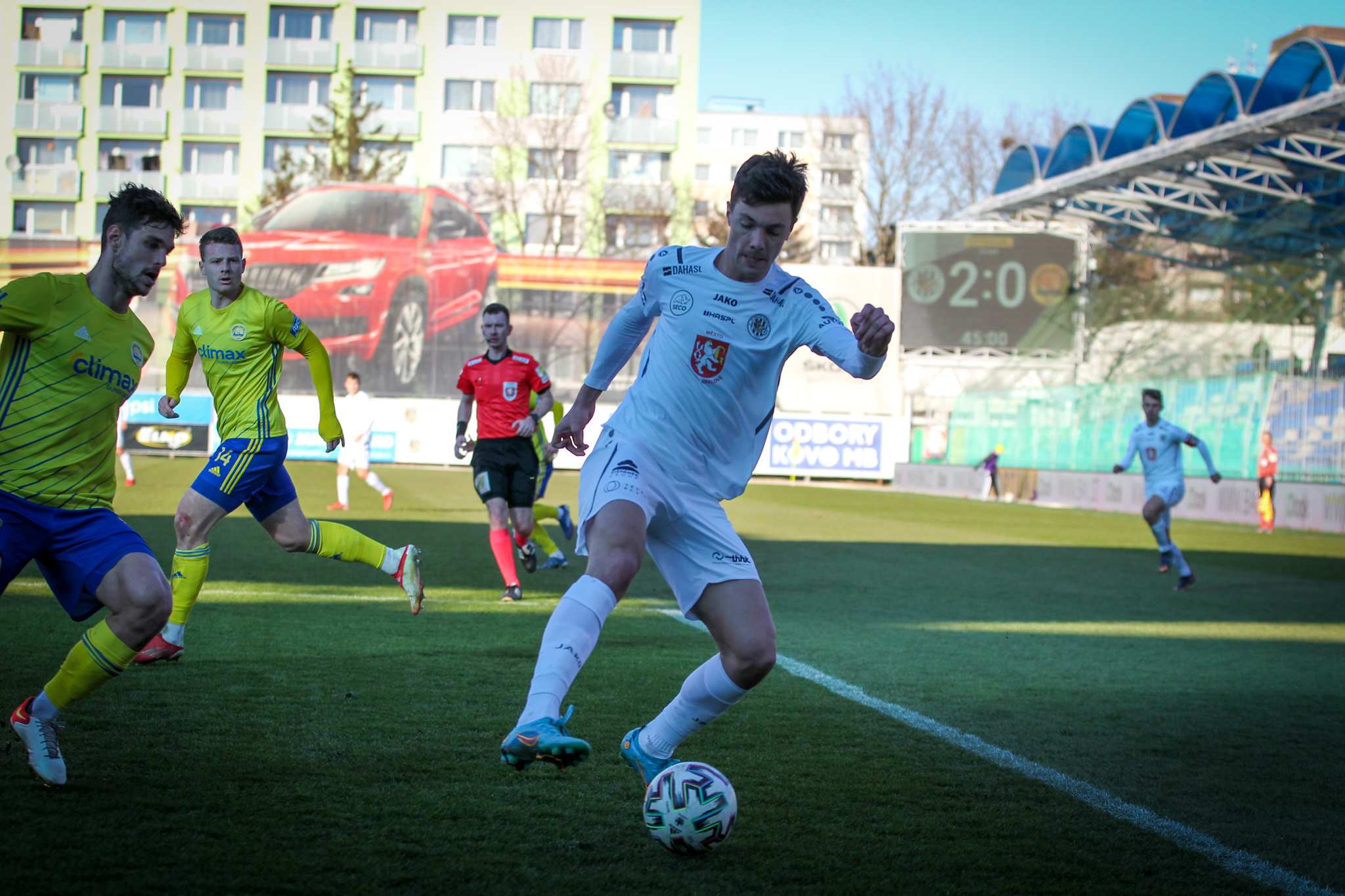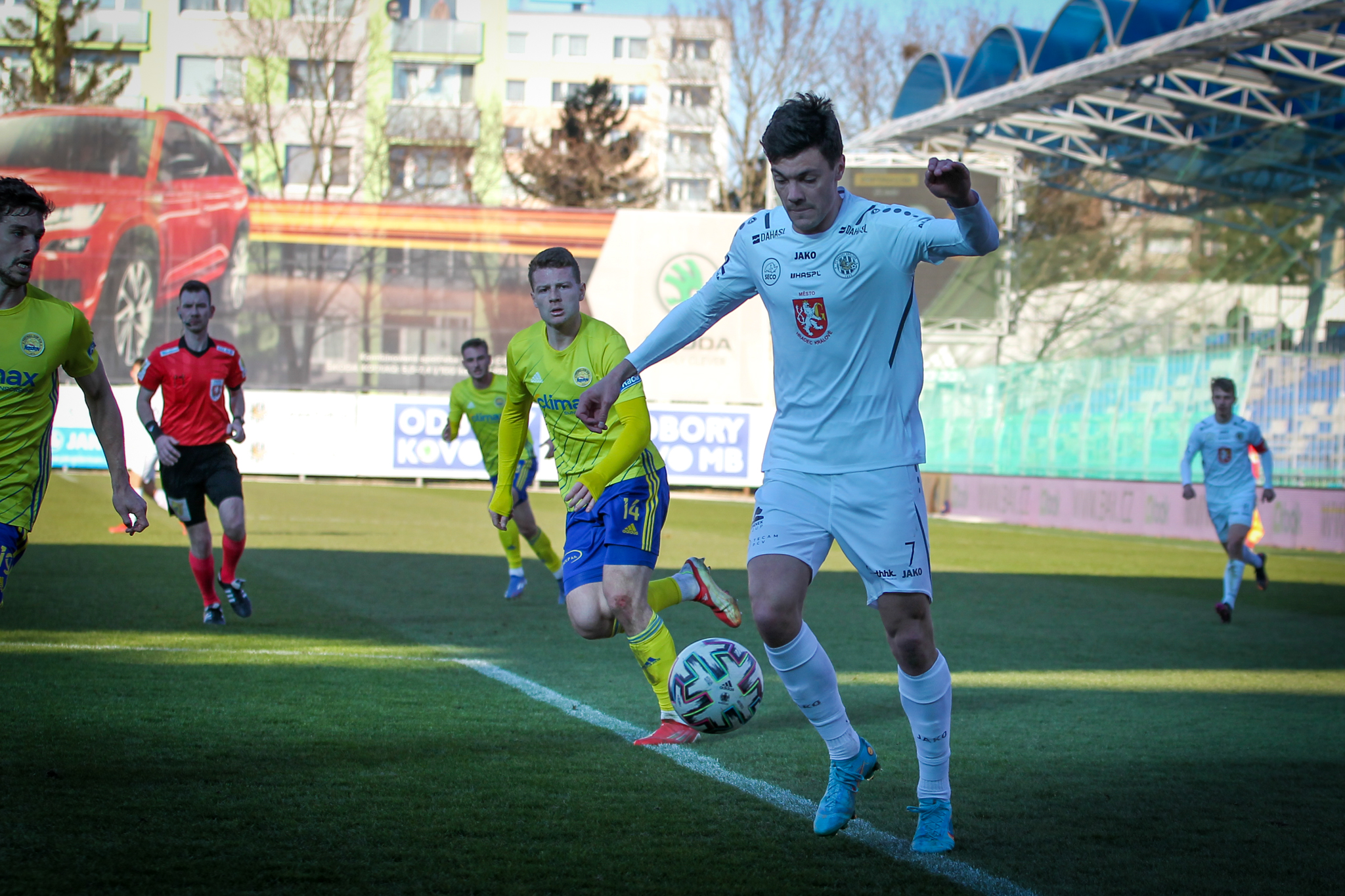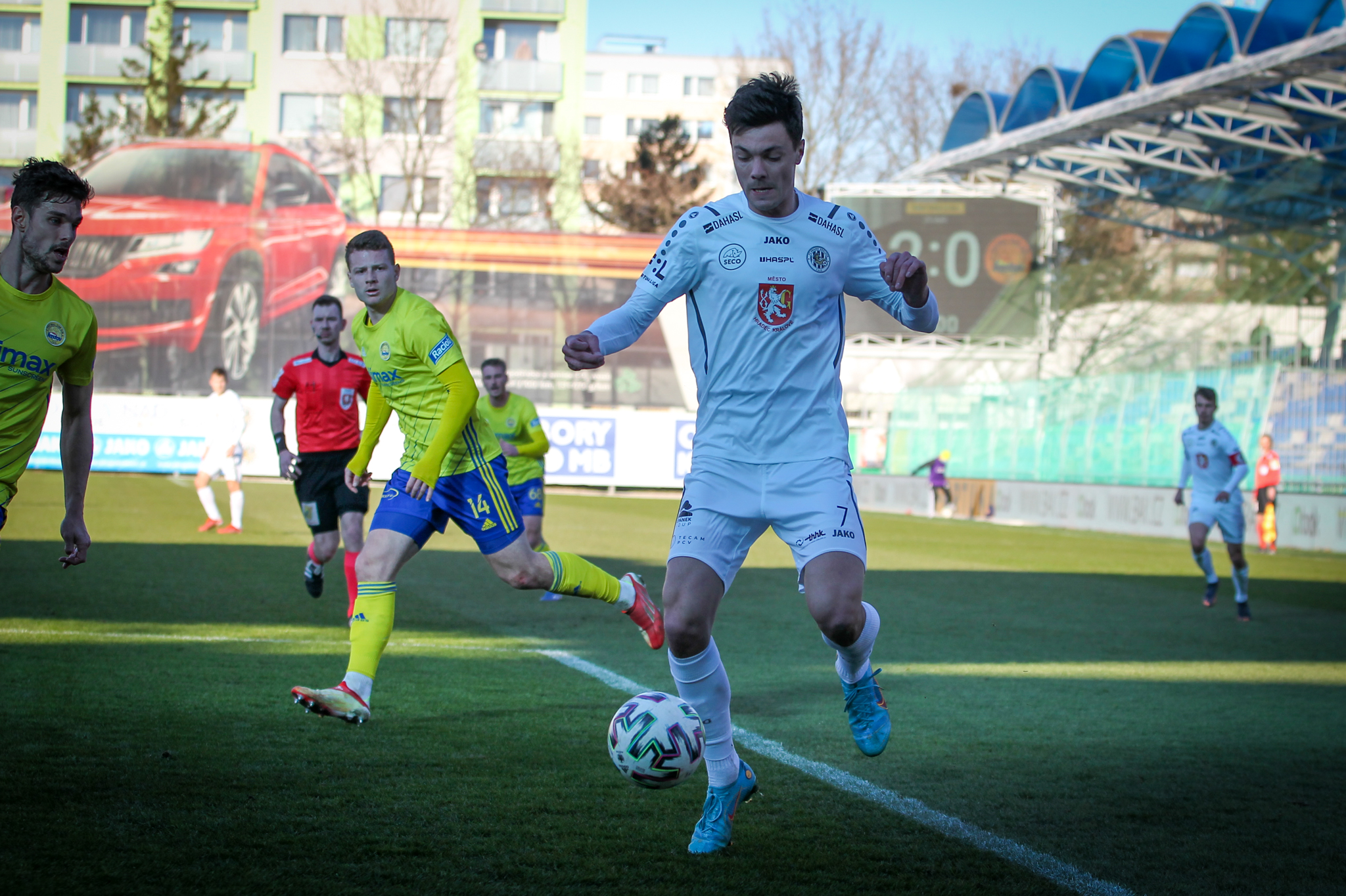 Úvod zápasu přinesl šance po standardních situacích. Ve 4. minutě hlavičkoval po přímém volném kopu z pravé strany mimo hradeckou bránu Dominik Simerský, hned potom se ale začalo dařit domácím.