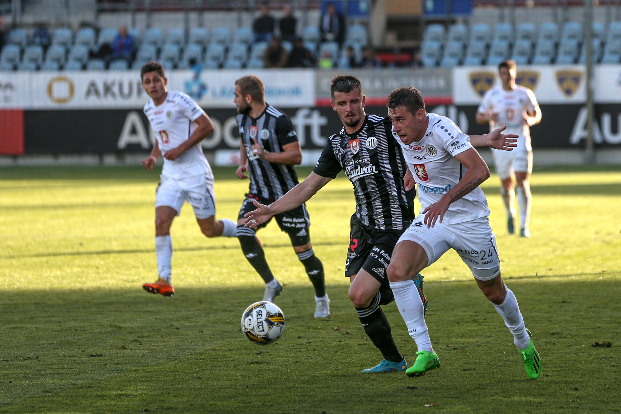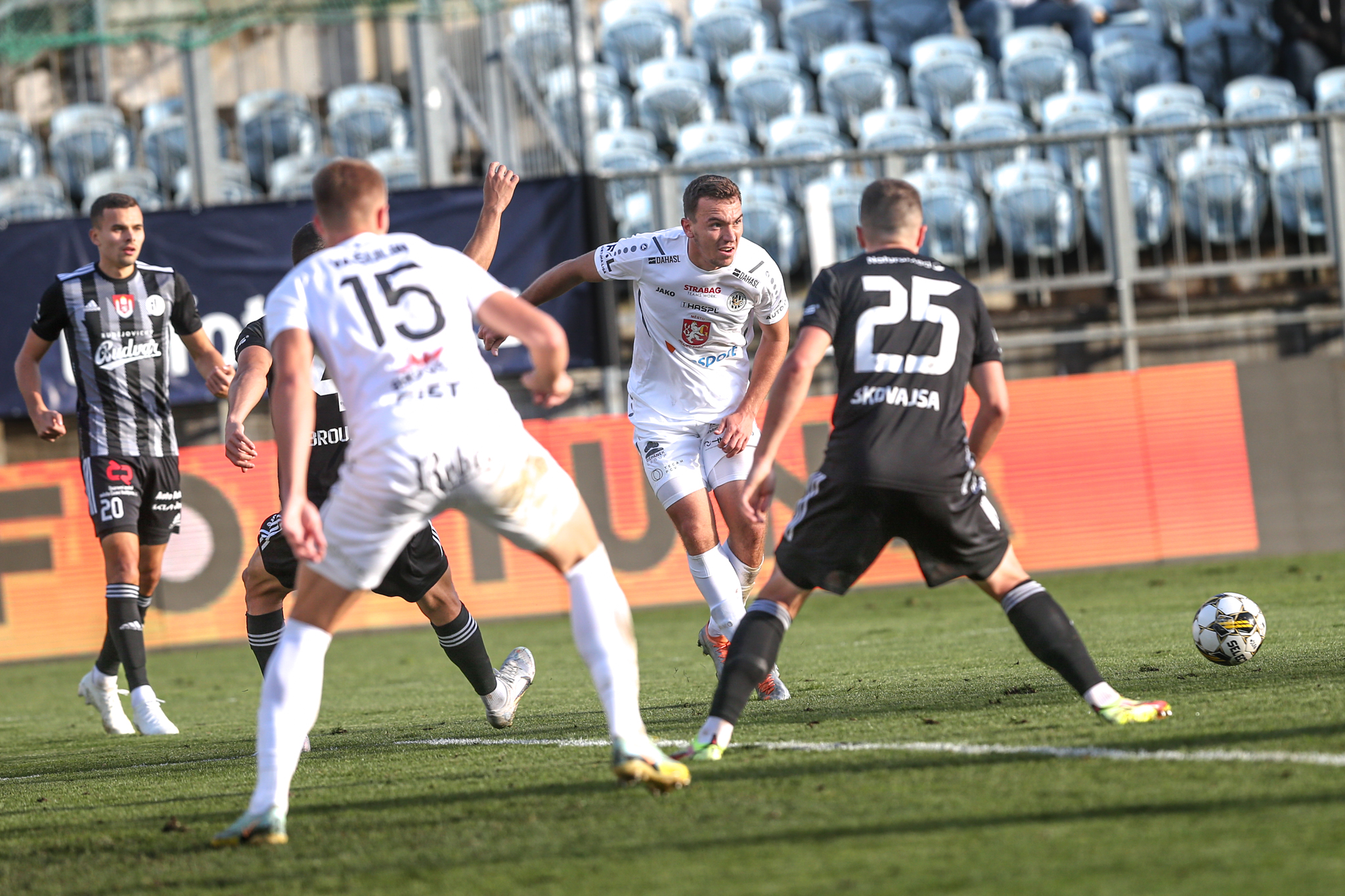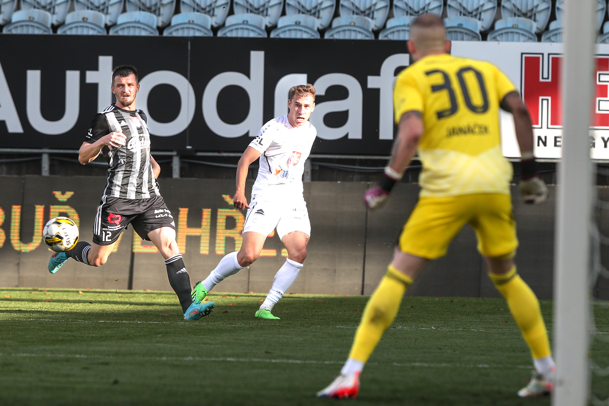 Východočeši však byli střelecky aktivnější a několikrát prověřili domácího brankáře, přičemž Smrž ve 23. minutě zkusil technické zakončení z velké dálky, které jenom těsně minulo pravou tyč budějovické branky. Zajímavě vypadala i průniková přihrávka po rychlé rozehrávce po odpískaném faulu, Kučerovi však chyběl krok do možnosti vystřelit z hranice malého vápna a Janáček míč přikryl. Největší příležitost poslat Hradec do vedení měl v 39. minutě Filip Kubala, kterého našel Smrž rozběhnutého v šestnáctce, zakončení mladého útočníka ale šlo jenom do boční sítě.